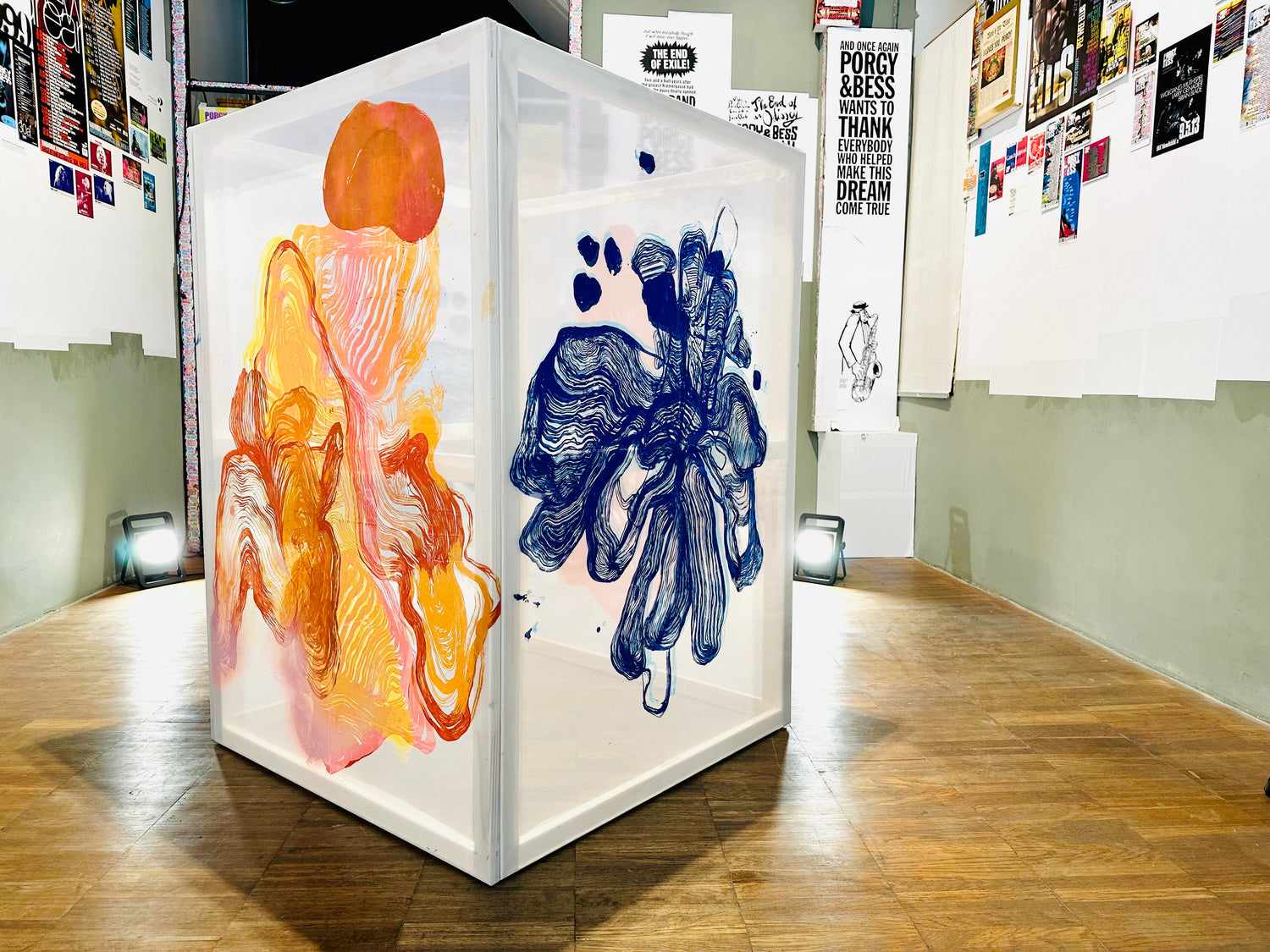 Bei den Werken der Installation im Porgy&Bess handelt es sich um einzigartige Siebdrucke, die auf analogen Tuschezeichnungen basieren. Jedes Stück ist ein Unikat und hat dennoch einen sich wiederholenden Charakter, wie die Erinnerungen, Denkprozesse und Gefühle, die wir individuell täglich erleben können.