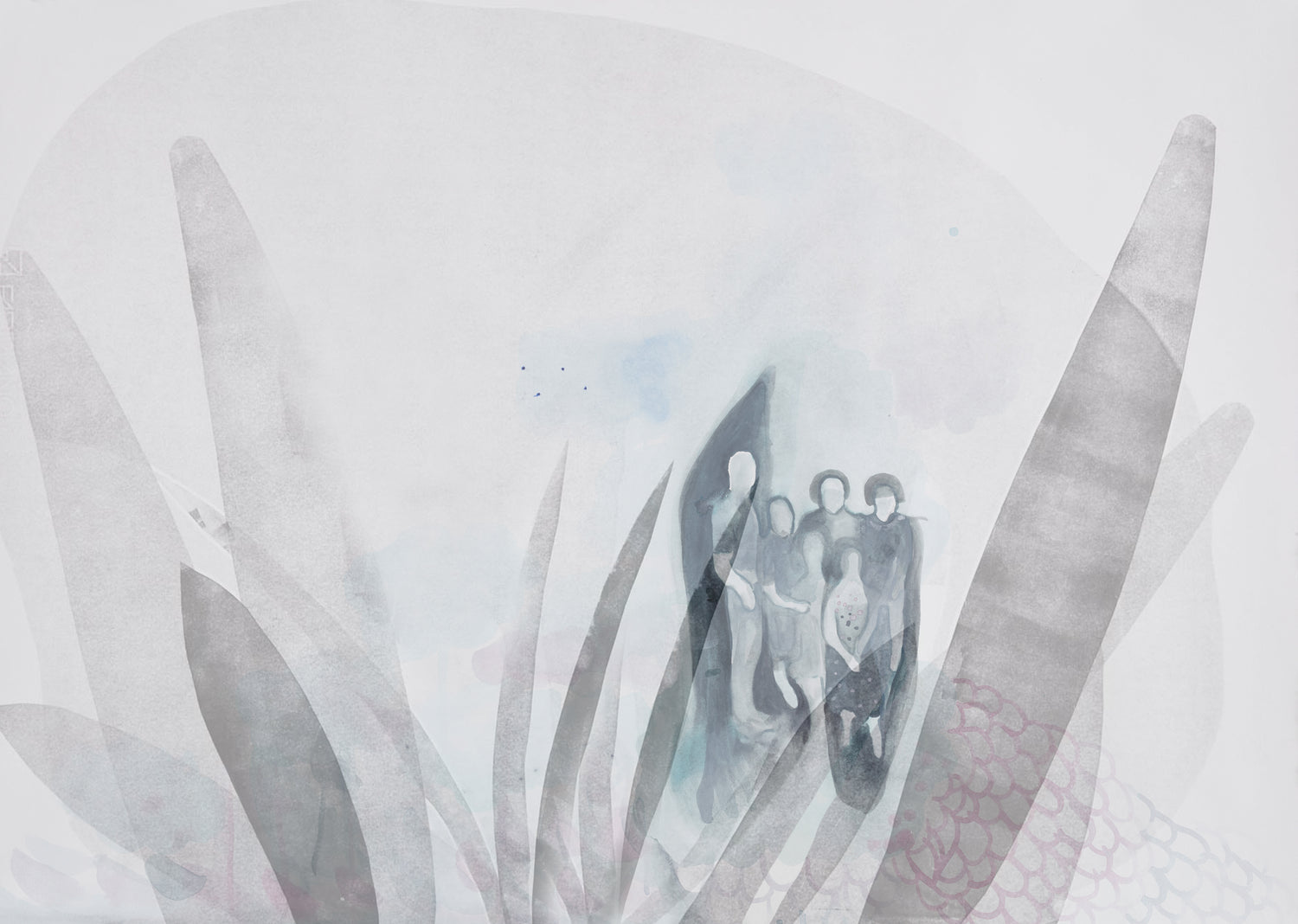 Abbildung: Karina Mendreczky, Die Verwandten, Hochdruck, Aquarell, Acryl auf Papier, 2025