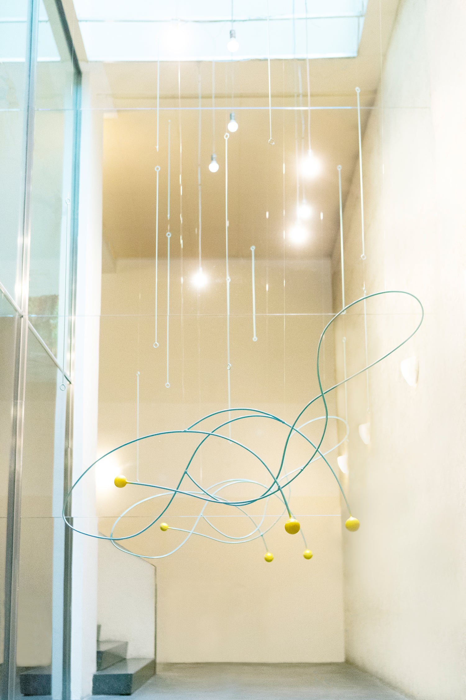 Viktoria Morgenstern sees her sculptures as intuitive drawings in space. The aesthetic of all the works remains reduced, characteristic of the artist's practice, where there is not a single line or color without function or reason. Everything consists of forms made of steel and brass, a material that not only has a grounding effect, but also allows the artist to connect with the world on a much deeper level.Fig. above: Viktoria Morgenstern, We all drink the same water, 2022, installation view in the jazz club Porgy&Bess, 2024