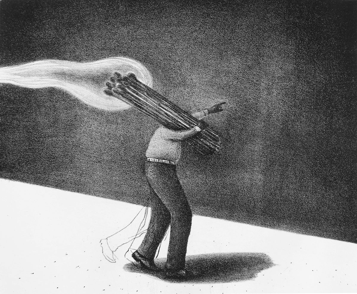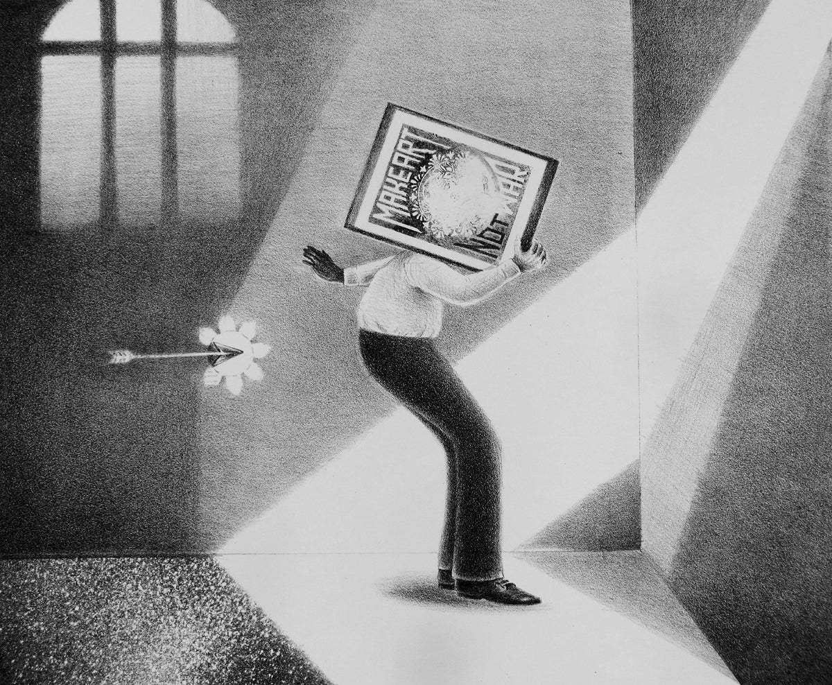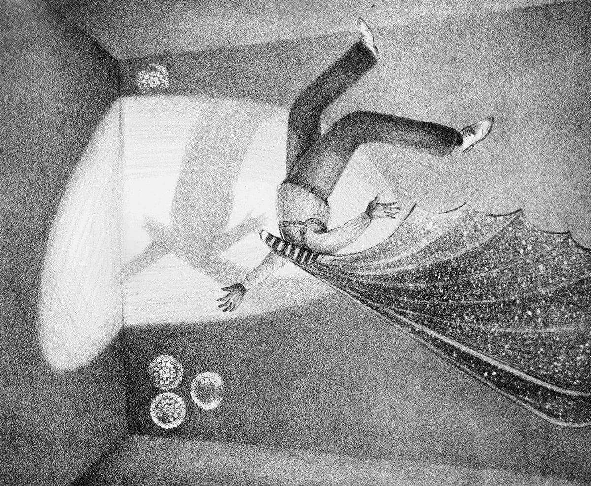 Falling Man is a continuation of the earlier work which has the ornithopter or artficial wings. In this frame the wings are too heavy so the protagonist seems unsettled and falling. Sometimes our over optimistic approach or desires end up in a similar manner.