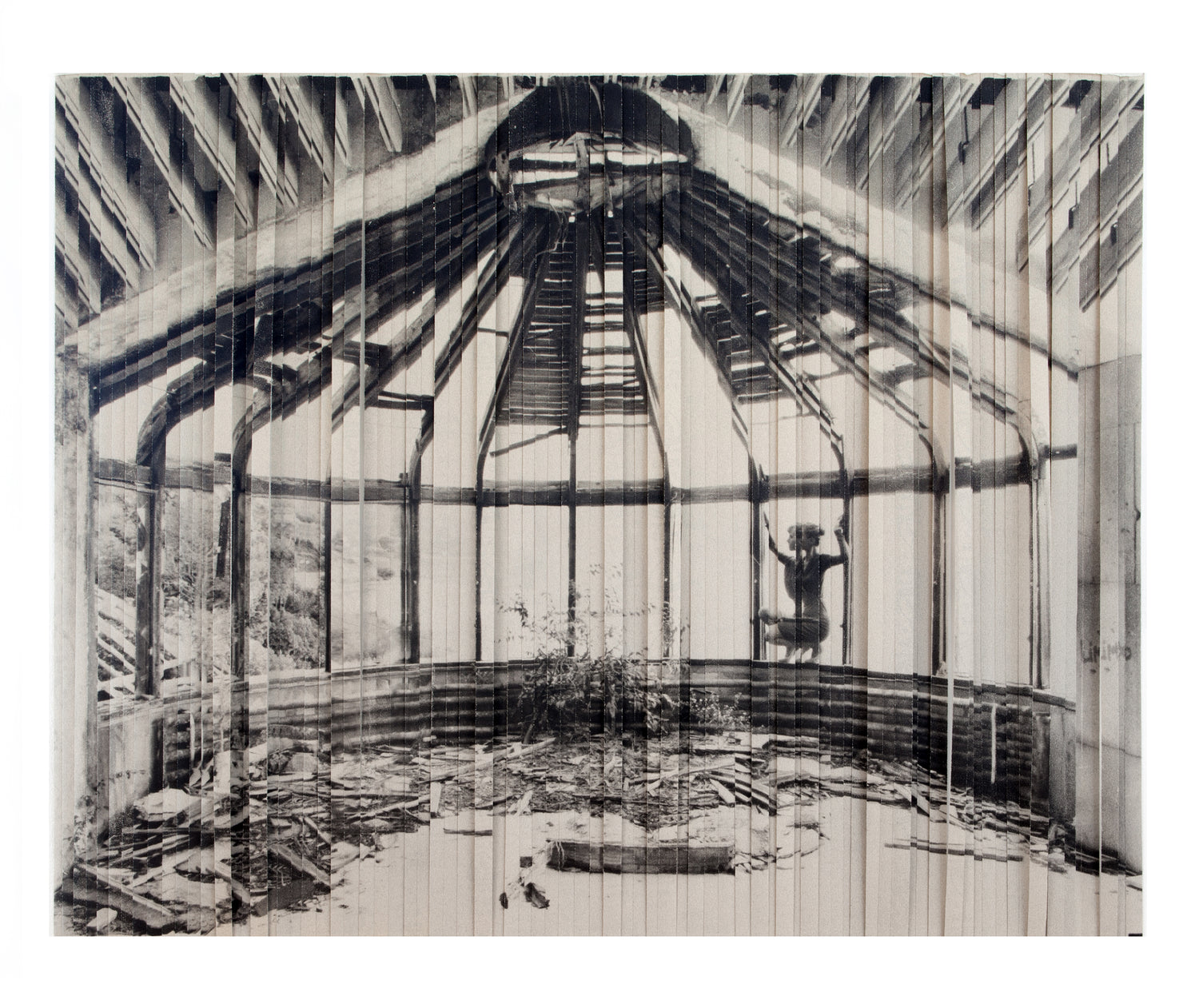 Photographs on cardboard, which is cut up and reassembled. The image on it is now fragmented and composed of many elements to a fragile appearing, depending on the angle of view changing, sculptural work.