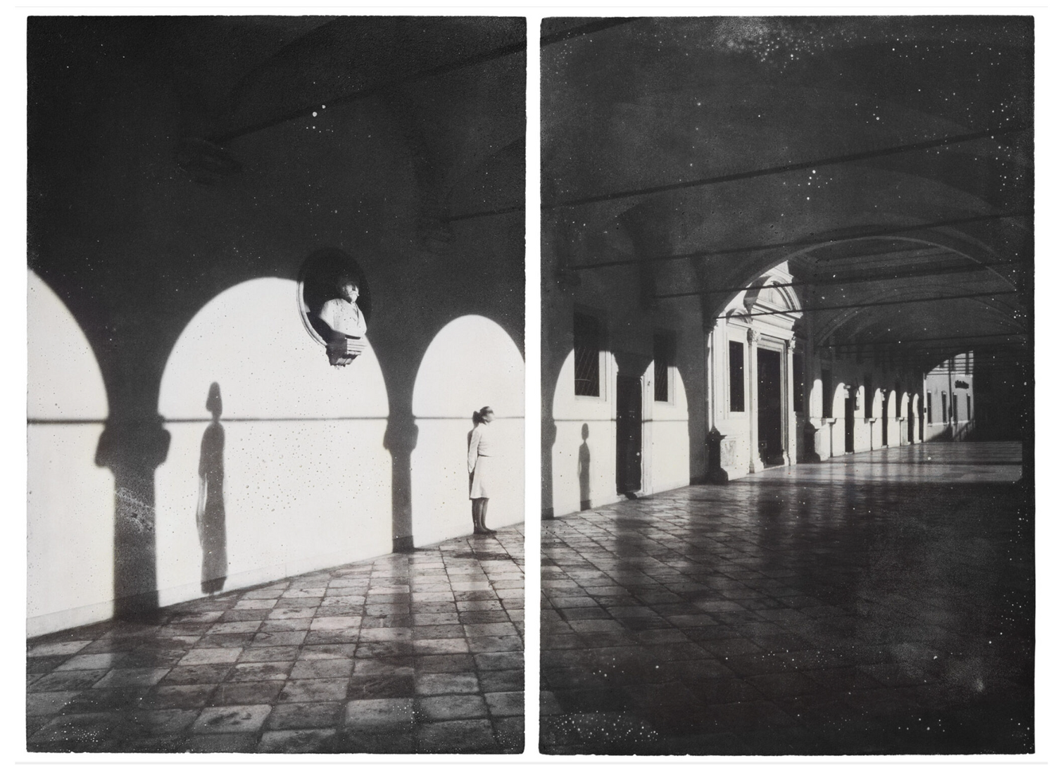 Figures and shadows follow a precise pictorial composition and are coordinated with architecture and lighting conditions. Sometimes they appear shadowy, as if they were the ghosts of days gone by, when the chosen places were animated or planned as such. The shell and basic structures of the architecture are often visible and an indication of the interrupted, originally conceived function. This is directly related to the staged figures. A narrative intervention is inserted, a momentary interruption that highlights the current emptiness of the place, but is also a reference to interpersonal isolation within our society.