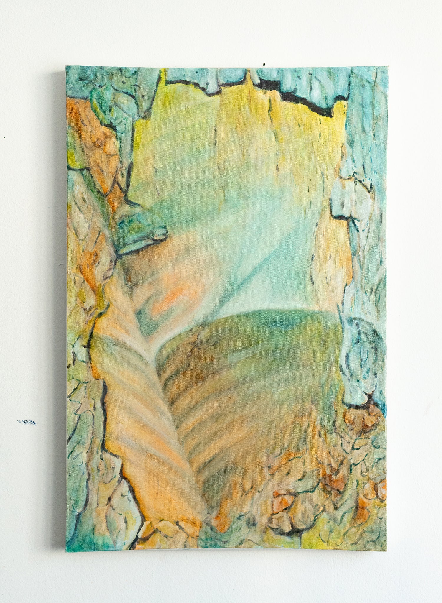 In Emma Kling's paintings, the veiling is just as essential as what lies beneath. She is concerned with the process and the act of unveiling, with putting on and taking off different layers. The layers of paint in her painting have a skin-like function. Materially, they form a boundary to the outside, while in terms of content, a protective shell is formed against power structures creeping under the skin.