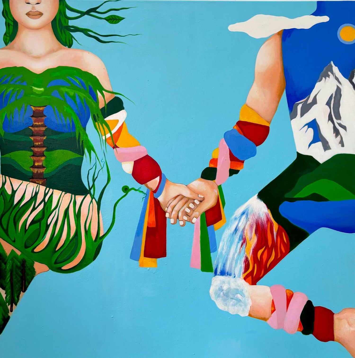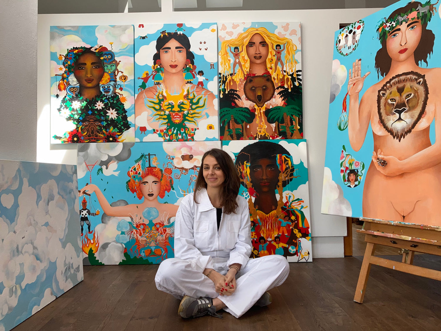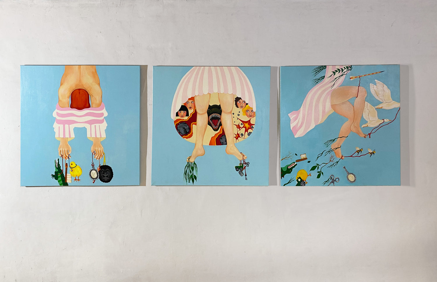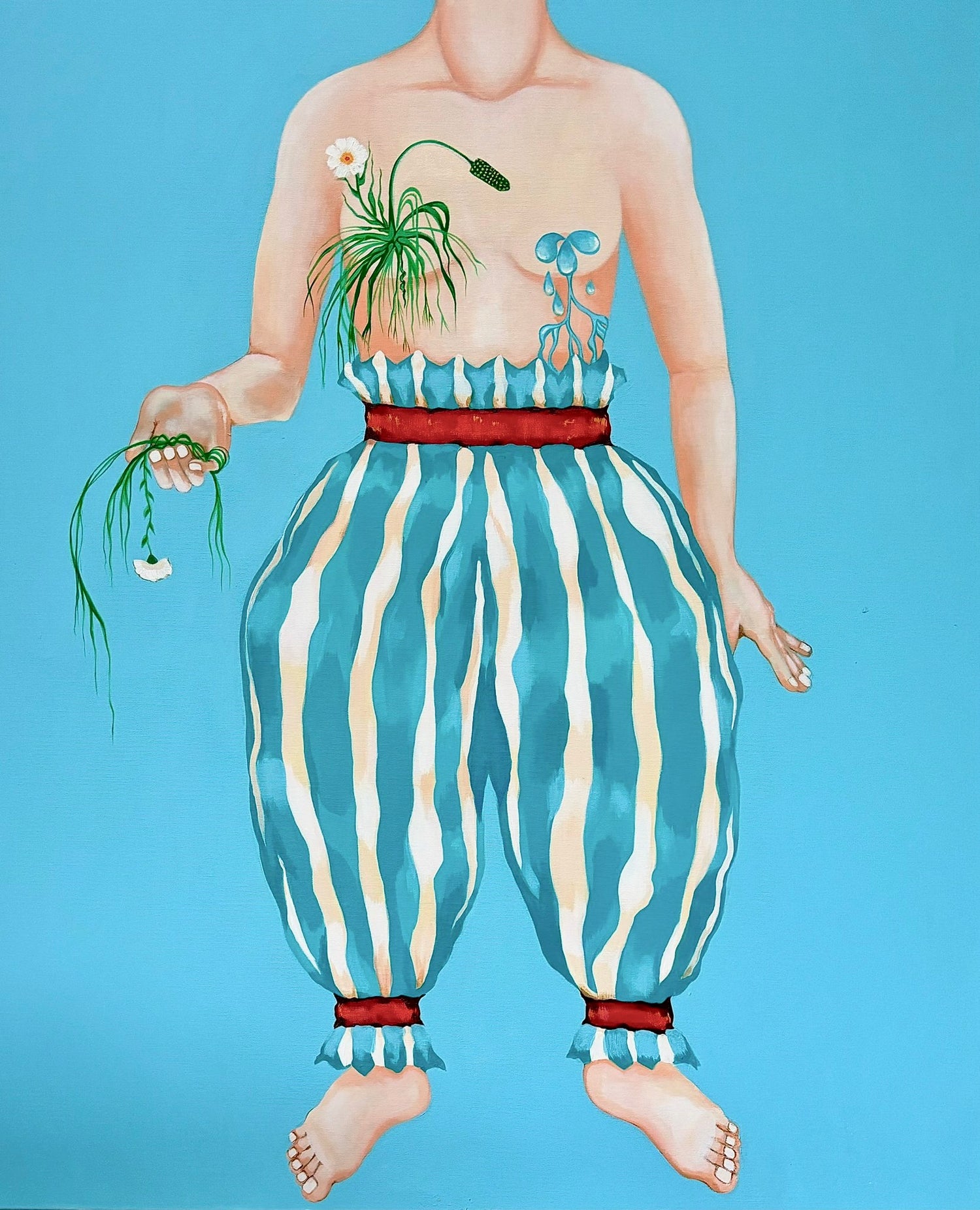 "My works are colorful, symbolic and humorous. They are about being human. We live in a fast, impressive world full of contradictions, which easily makes us forget our focus on our simple being. Each painting deals with a specific theme and is a self-contained little cosmos. It is a moment of silence and contemplation, a time out from everyday life. In my paintings, the human body symbolically stands as a vessel for inner processes as well as emotional states and thought processes."