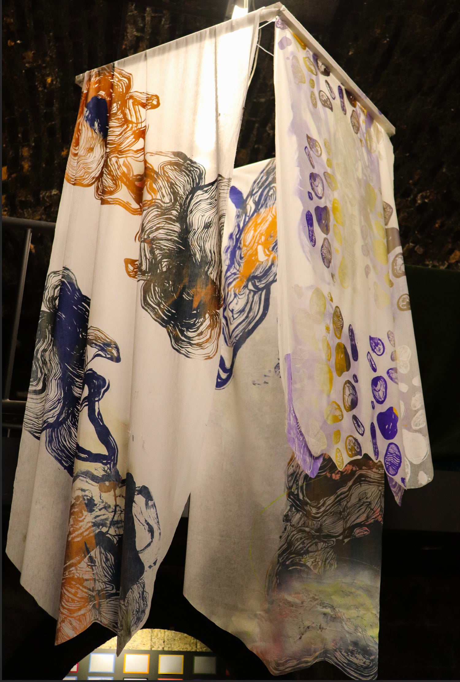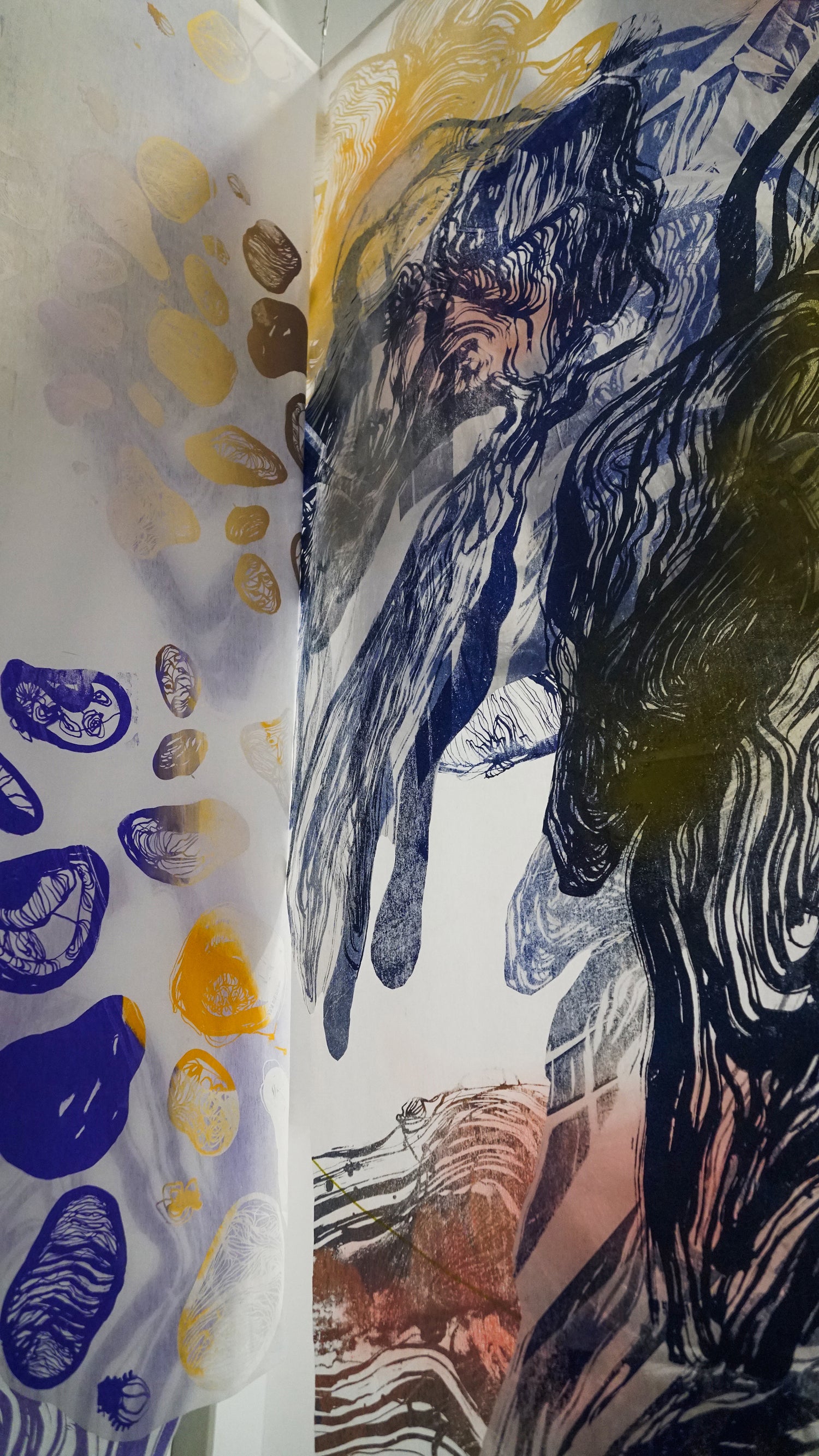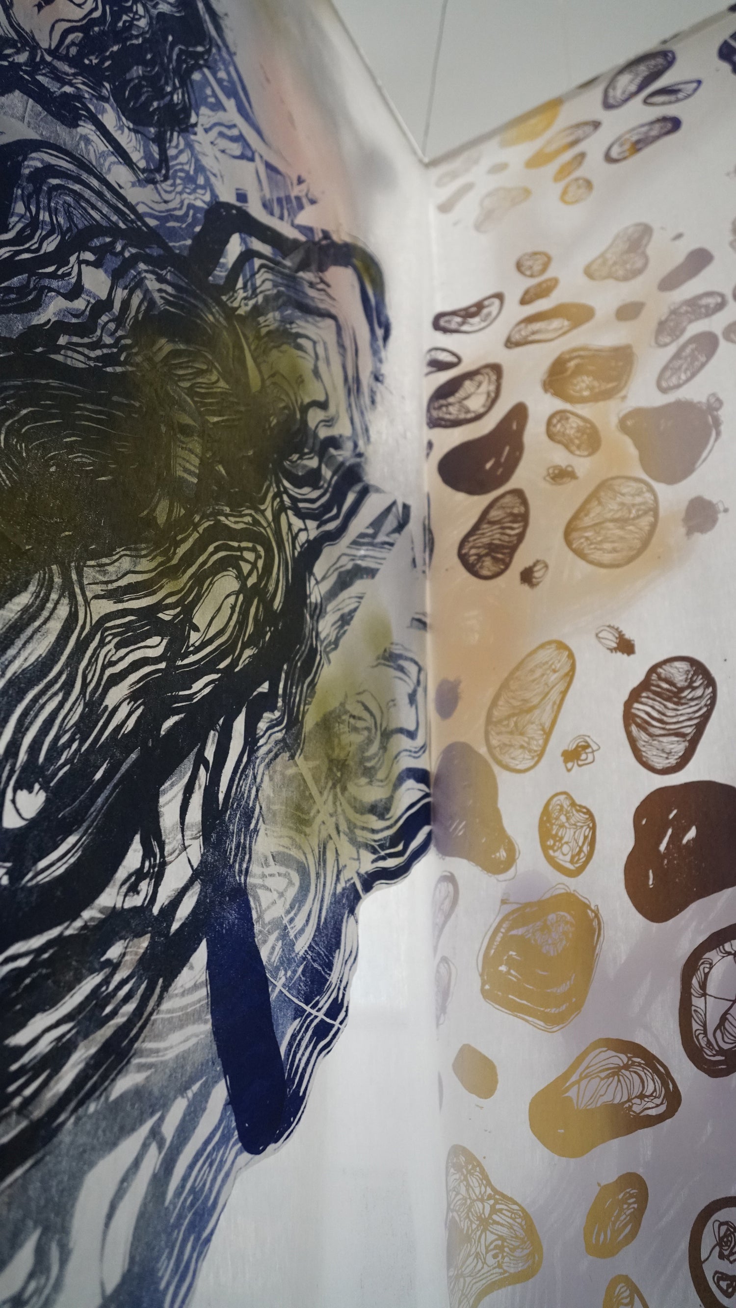 By presenting imagination as a kind of materialised fiction, which for her is closely linked to the idea of the relationship between presence and absence, Marinova invents her own reality and explores the deep constellations of perception, thoughts, feelings and memories. Marinova works primarily in the field of screen printing, drawing, installation and book art, using such diverse materials as fabrics, paper, transparent foils and wood as canvas for her screen prints. With such a variety of surfaces, the only constant is the large scale.