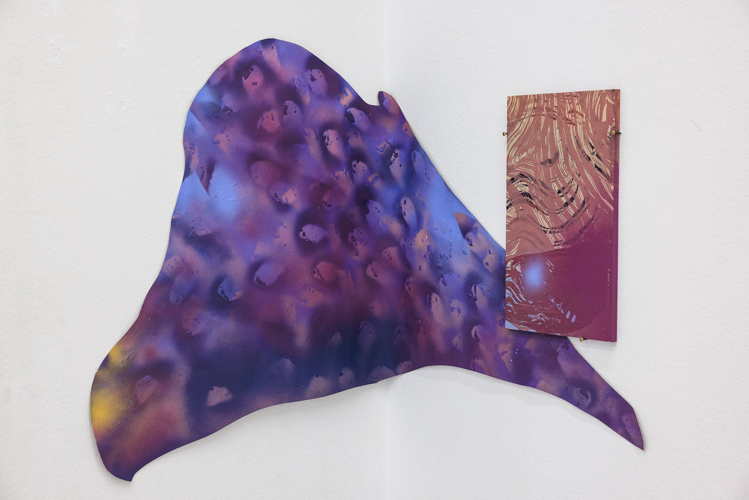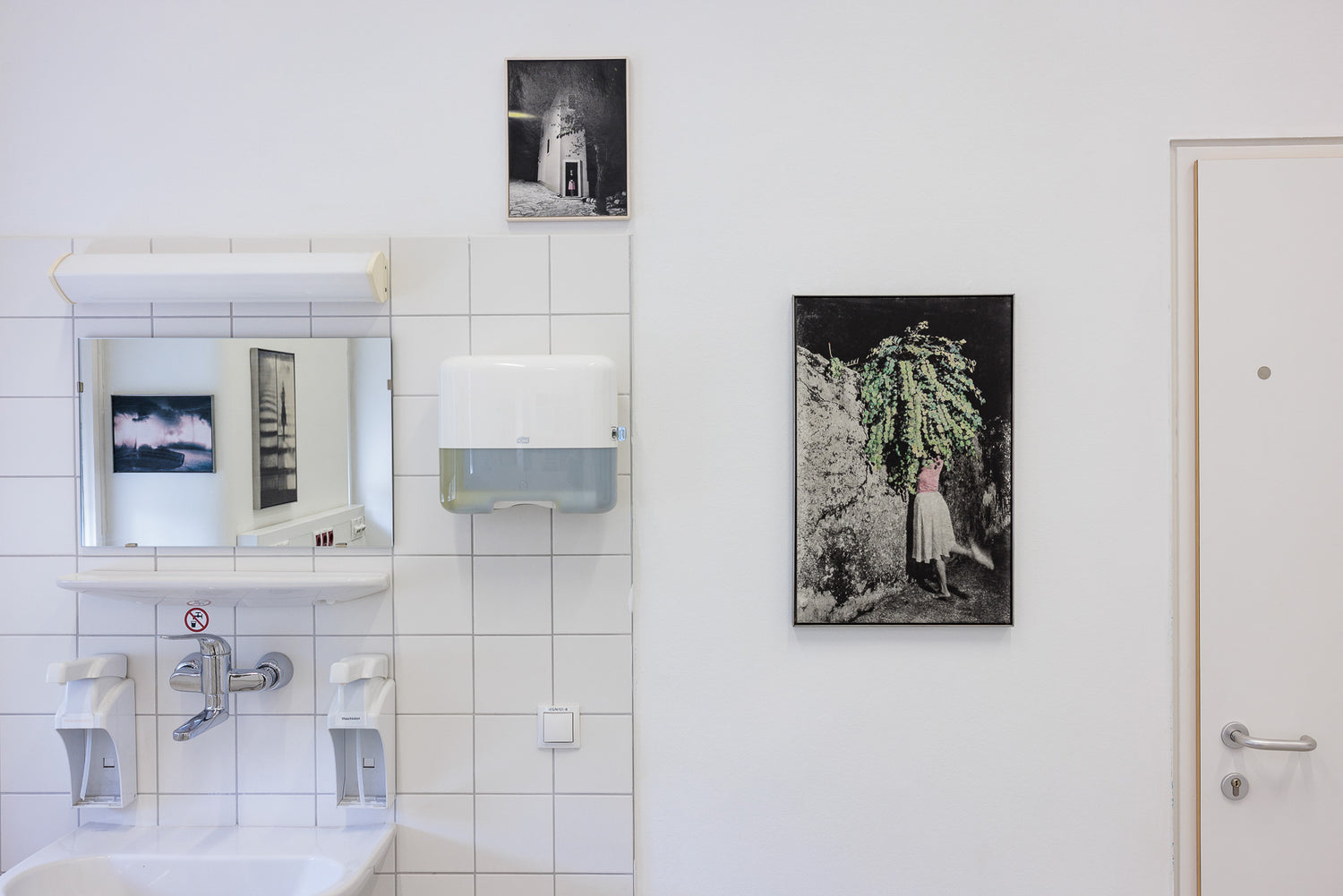 Birgit Graschopf, Almost, Fotografie auf Faserzement, handkoloriert, Edelstahlrahmen, 63 x 42 cm, 2025, Unikat (große Arbeit rechts im Bild)