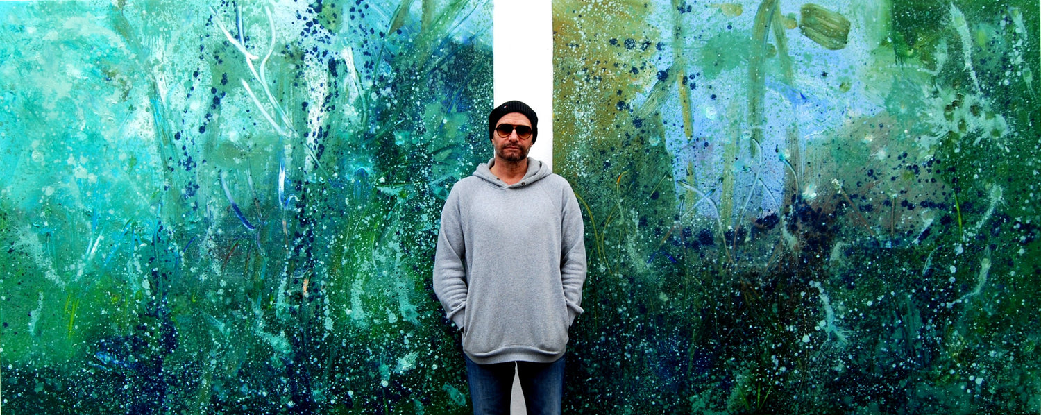Seine Gemälde bestehen aus mikroskopisch kleinen Elementen, fließend ordnen sich verschiedenste Grün- und Blautöne in sanften Übergängen auf der Leinwand an.