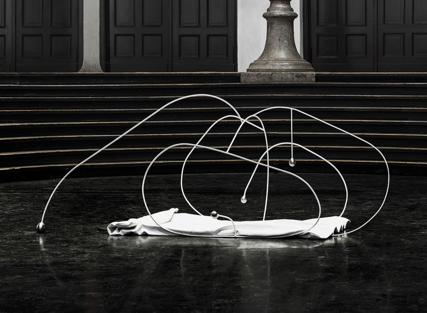 Arbeit links: Viktoria Morgenstern, Into the Inferno #1, 2023, Handbemalter Stahl, Messing, 160 x 50 x 35 cm